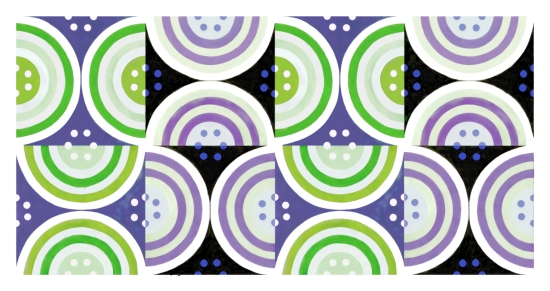 Circles motif in greens, purples, blues with black and white. Can be fabricated in fabric and wallpaper as well as art prints.