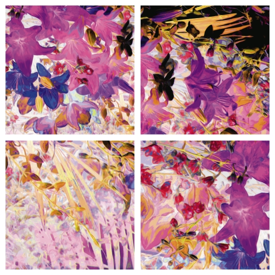Val’s Flowers is separated into 4 smaller images: They can be grouped together in square format, linear format, or individually. Just let us know.