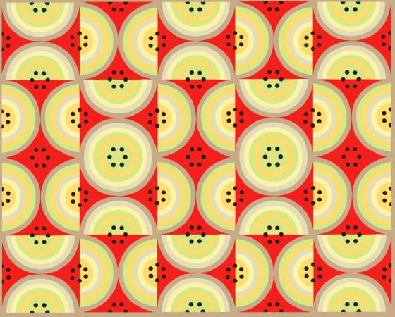 This brightly colored version of Circles motif, red, yellow, green with black and taupe can also be fabricated in wallpaper or fabric.